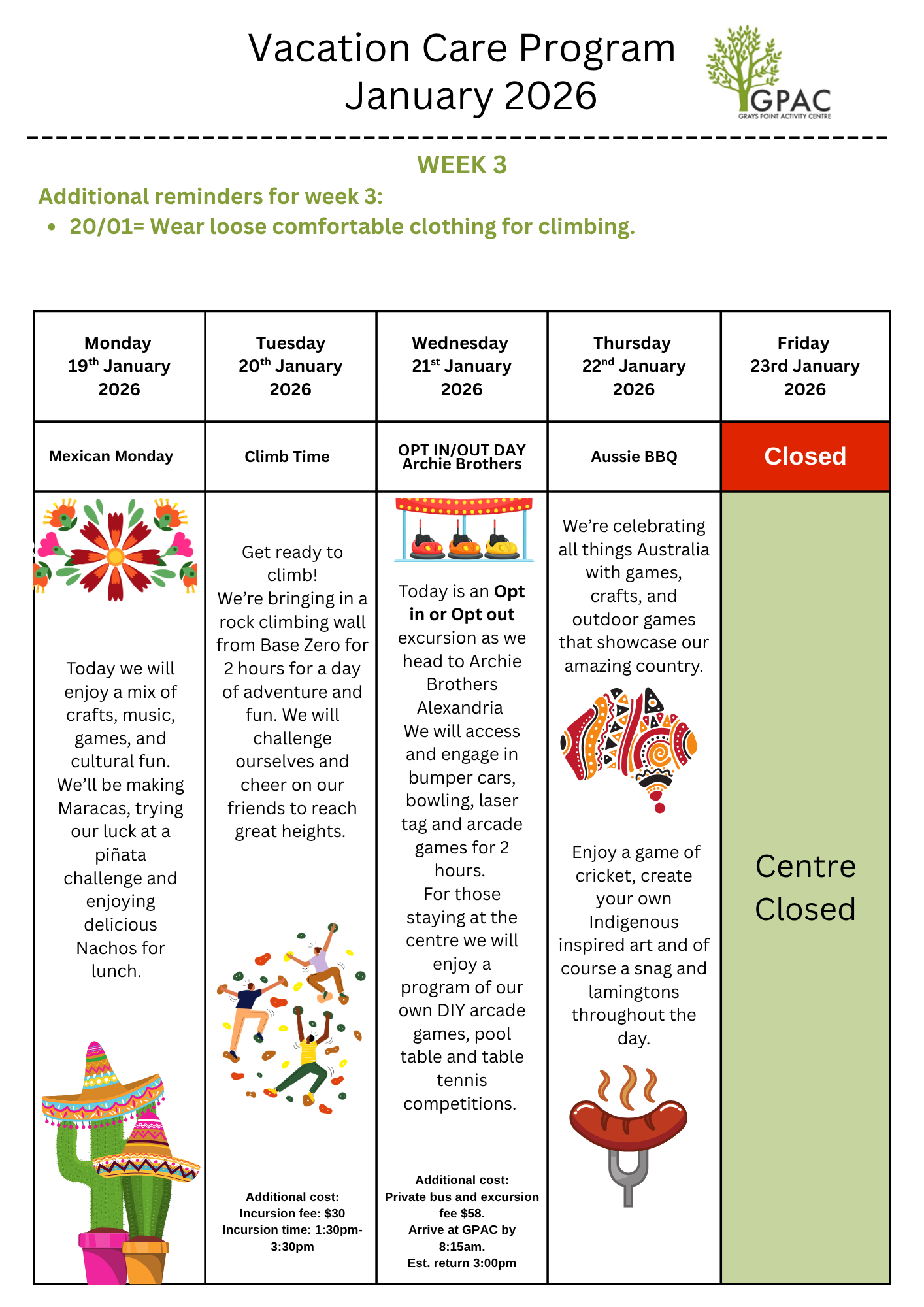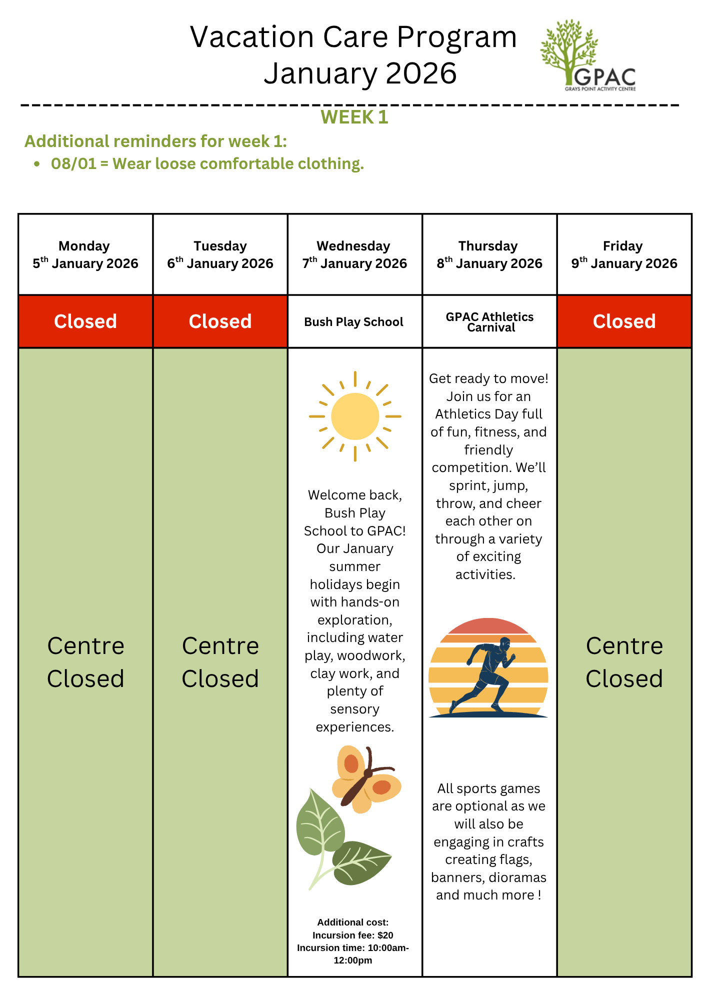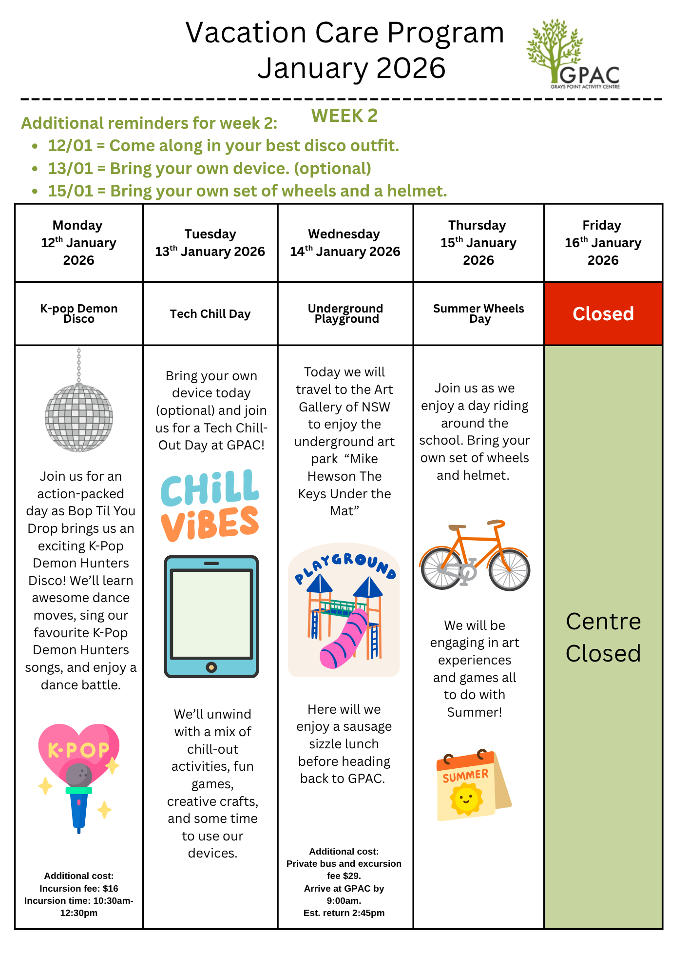 GPAC families who have active outside school hours bookings will have priority over new families. The Centre will not open unless we reach a minimum number of confirmed bookings.