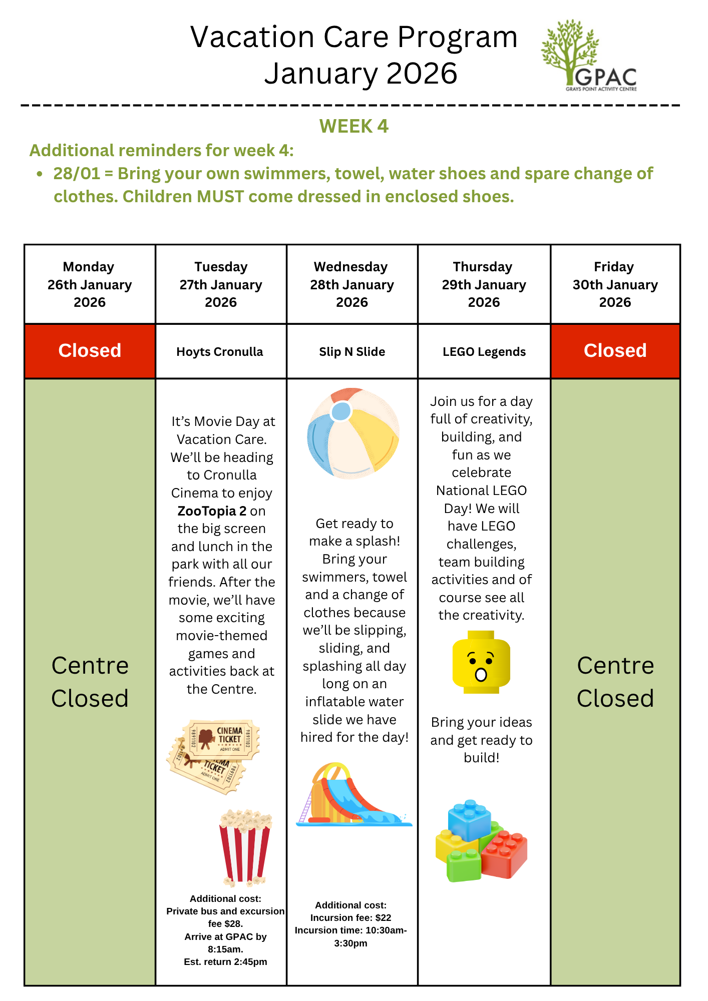 - Access the Centre during Vacation Care from the side gate near Grays Point Soccer Oval.